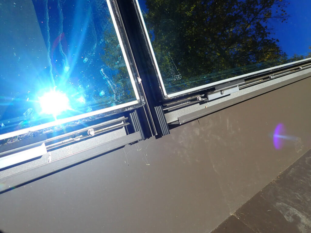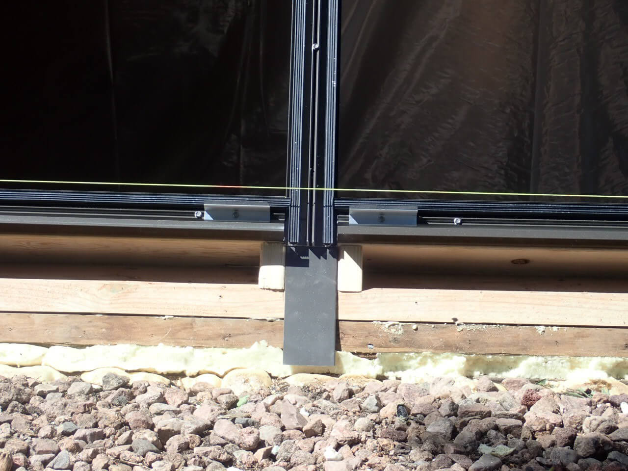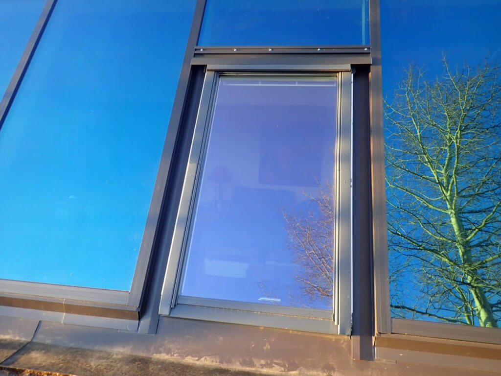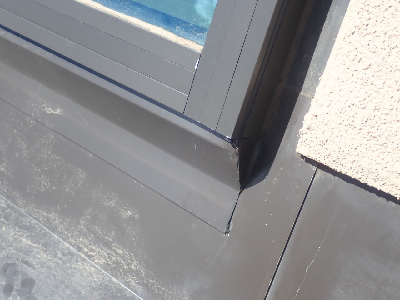 Flashing applications must have counter-flashing under and over the aluminum glazing system bars. It must encompass and overlap the perimeter of the aluminum glazing bars on the upper part of the glazing bar frame as well as cover the top surface of the wood rafter beams.