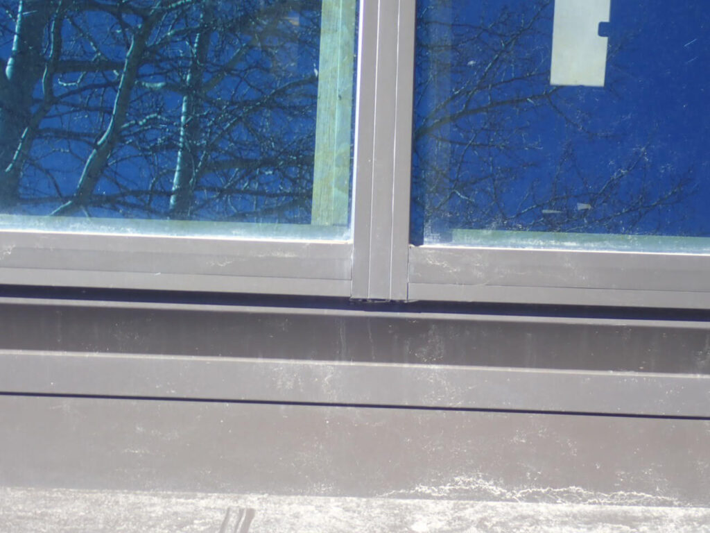 As a result when vinyl window frames are placed in a sloped application without proper exterior aluminum flashing, and without direct point loading application, the glass panels will sag and the seals will fail over time causing moisture between the insulated glass panels and interior leaks. This is evident by the numerous traces of water leaks on the interior wood trim.