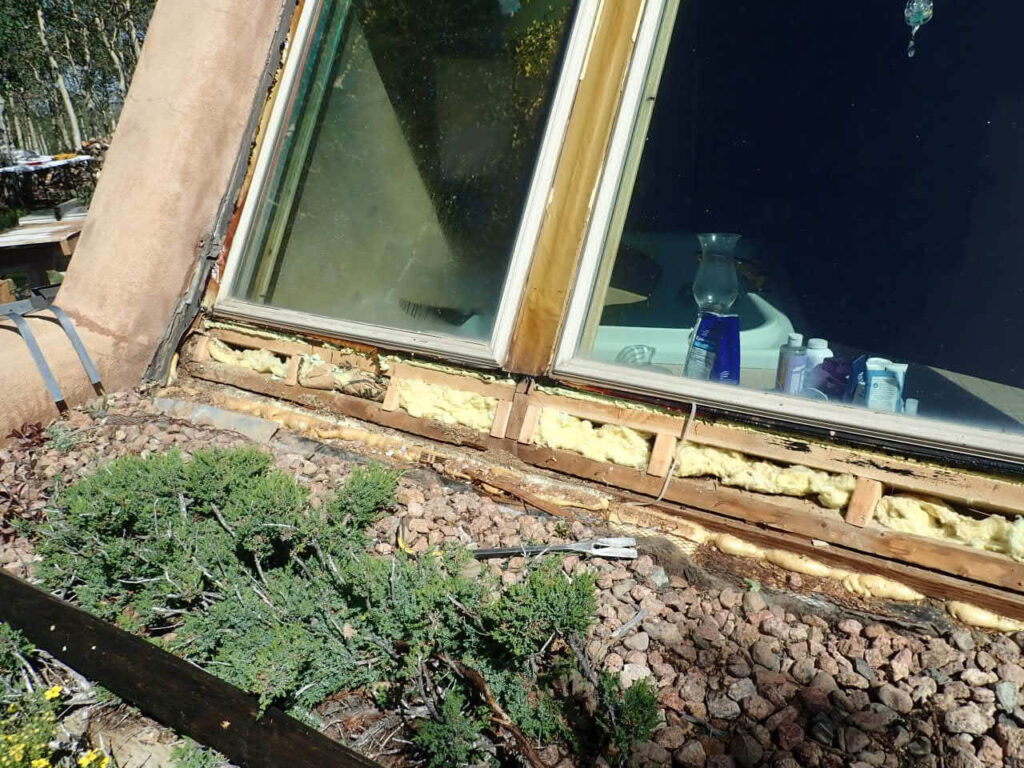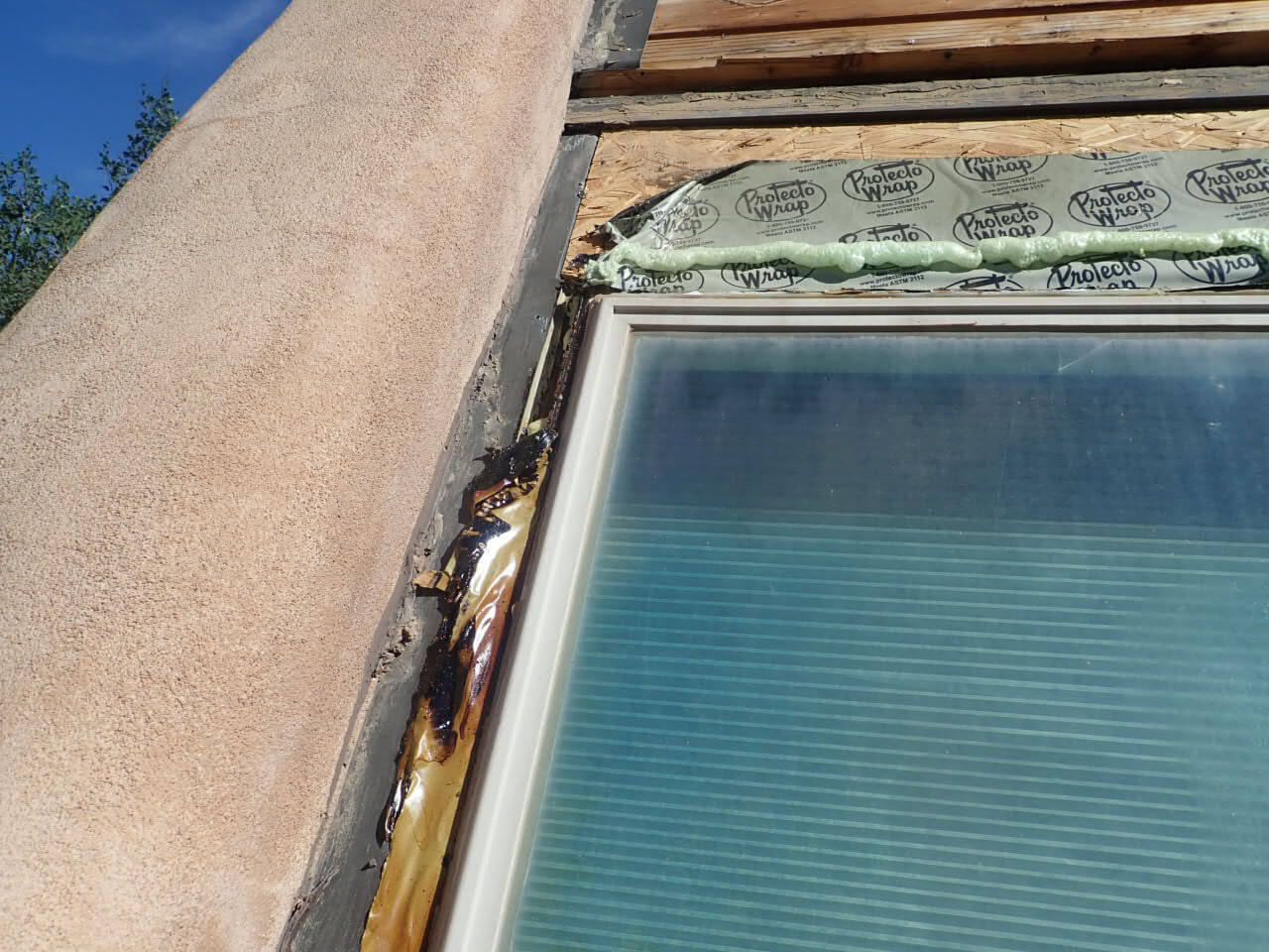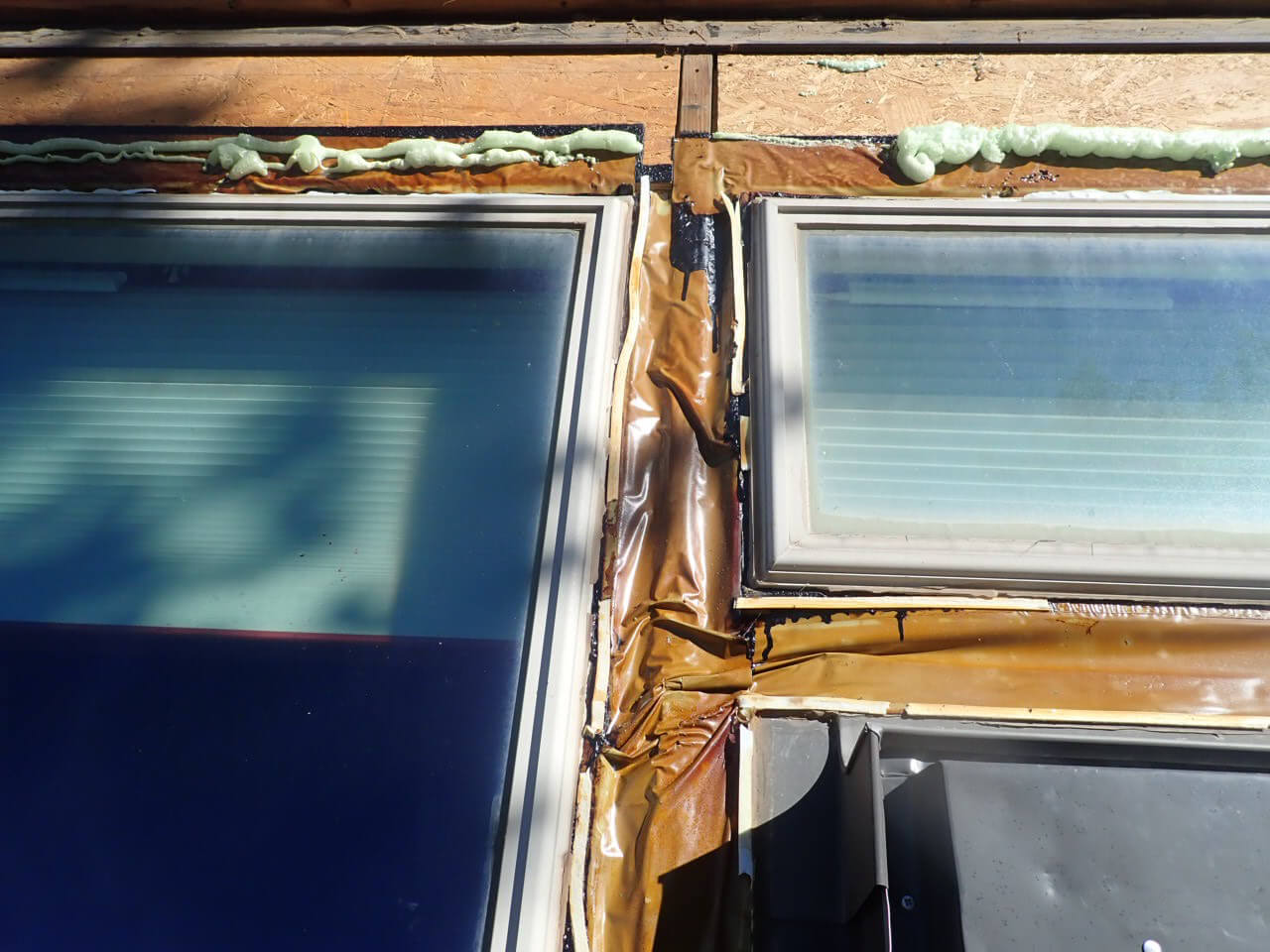 In the 1 st picture, notice the old vinyl frame windows in-between the rafter beams, wrapped with 0.19 brown flashing …. the middle picture shows the vinyl interior frame and glass resting on a flimsy 1/2” wood trim… weak support… the 3 rd picture shows what happens when asphalt based 4”window wrap and spray foam is used.. the heat from the sun literally melts the wrap and foam rendering it useless and ineffective…