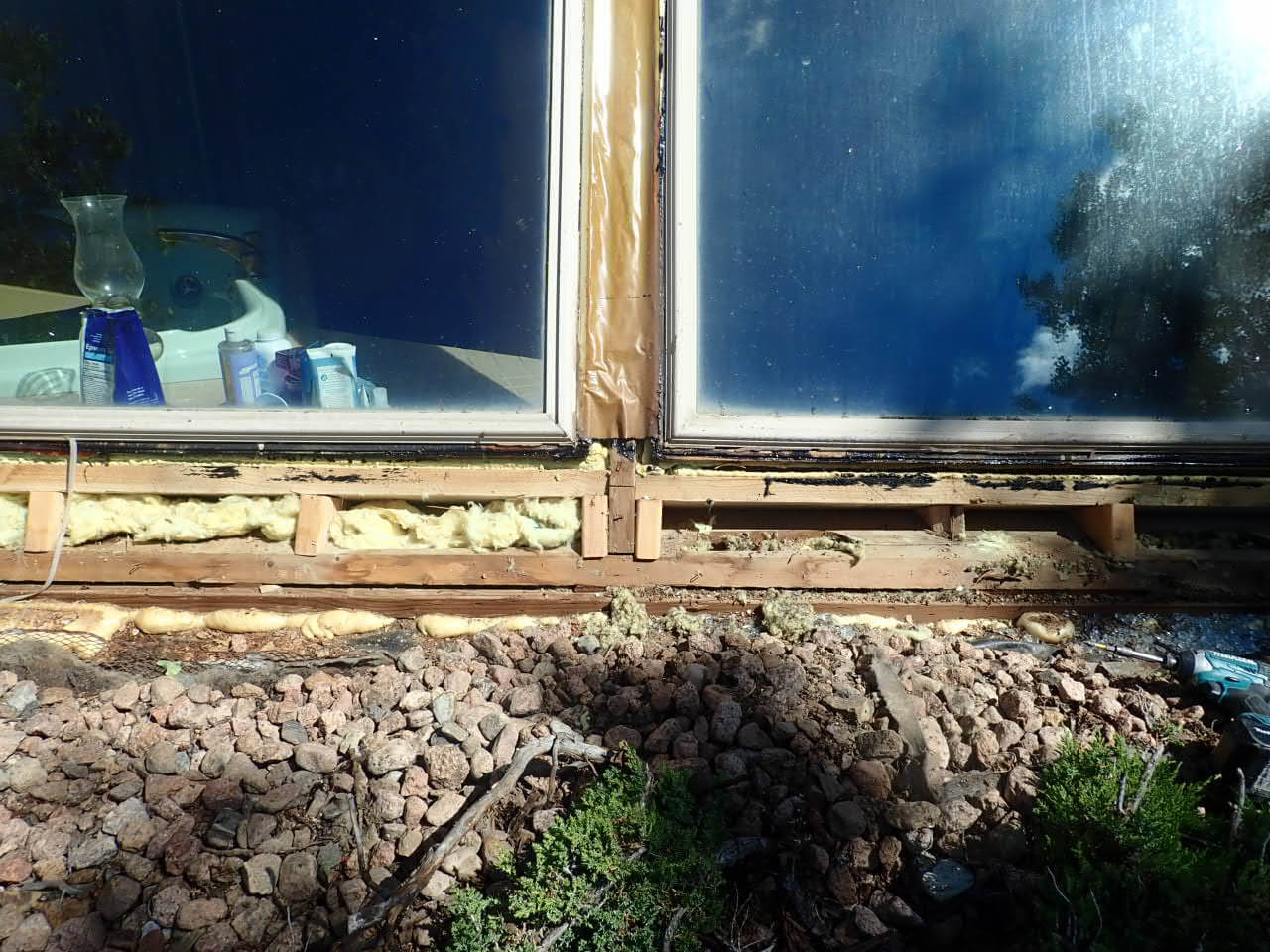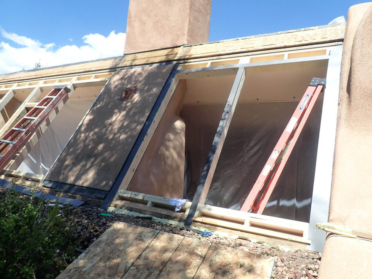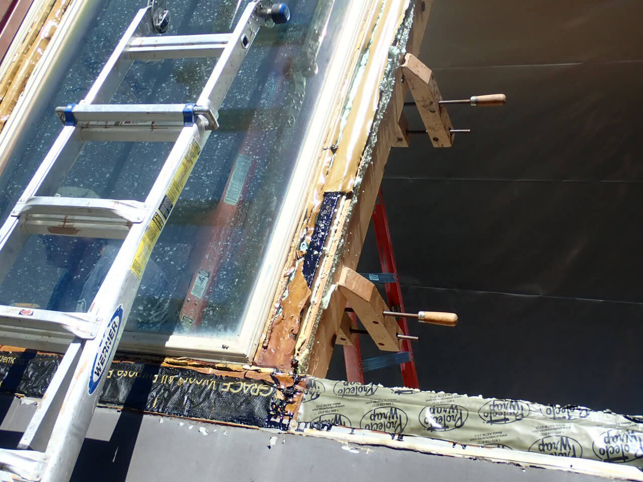 In the 1 st picture, notice the old vinyl frame windows in-between the rafter beams, wrapped with 0.19 brown flashing …. the middle picture shows the vinyl interior frame and glass resting on a flimsy 1/2” wood trim… weak support… the 3 rd picture shows what happens when asphalt based 4”window wrap and spray foam is used.. the heat from the sun literally melts the wrap and foam rendering it useless and ineffective…