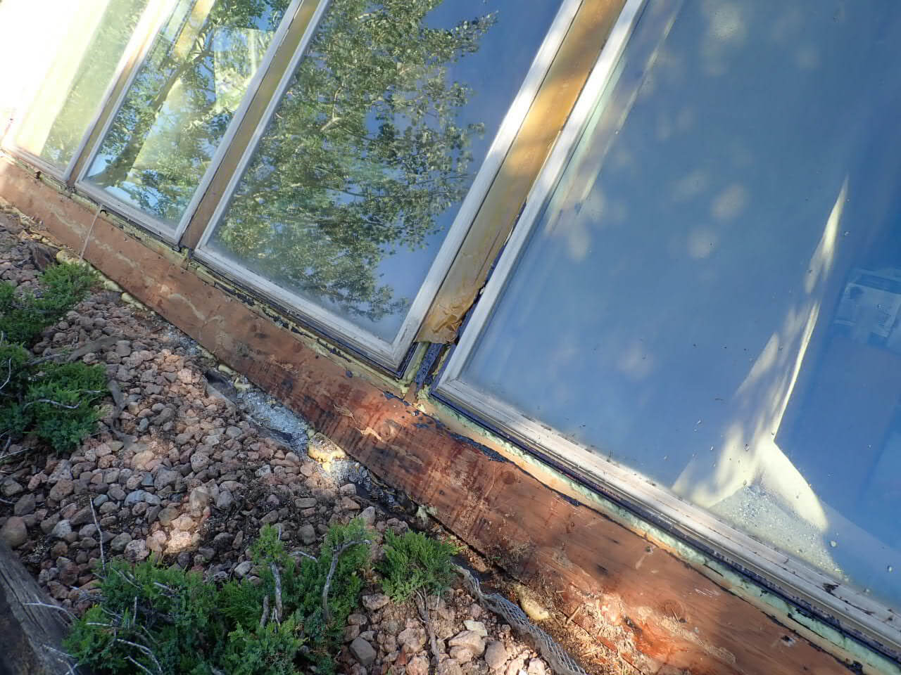 The much improved result by using Pro Seal, aluminum glazing systems, and the right flashing applications, should last a lifetime without any issues … The new insulated 1” thick Low-E glass panels are tempered / tempered – totally supported, sealed and protected from wind, UV rays, natural movement, and because the glass is elevated up from the wood beams, this allows for expansion and contraction, minimizing seal failure, cracks and seal separation.